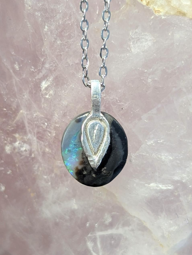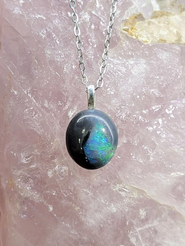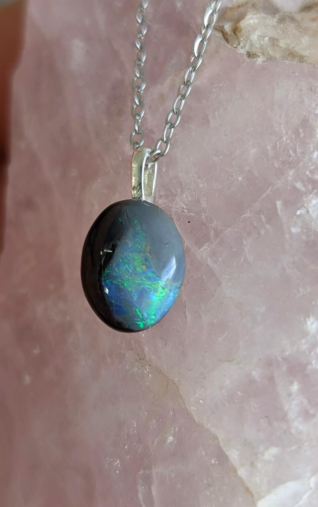 Magnifique et atypique pendentif en opale d'Australie de lightning Ridge. Base grise et noire.Feu vert/bleu bien marqué et visible ! Livré dans son écrin noir, avec sa bélière argent 925 et sa chaîne en acier inoxydable de 40cm + 5cm. Opale de 13x11mm.