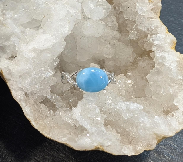 Magnifique bague ajustable en argent 925 rhodié avec Superbe Larimar. Taille de la pierre: 10x8mm.