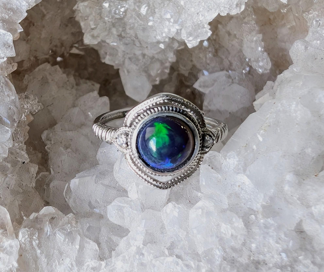 Magnifique bague ajustable en argent 925 avec opale Éthiopienne fumée. Taille de l'opale : 7x7mm.