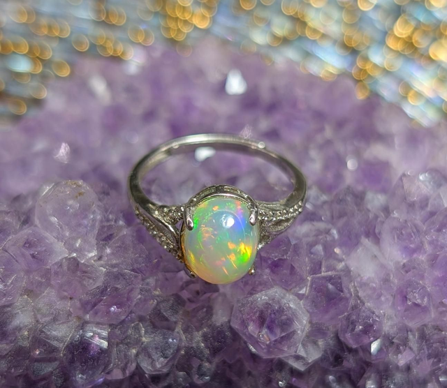 Magnifique bague ajustable en argent 925 rhodié avec opale Éthiopienne. Taille de l'opale : 9x7mm.